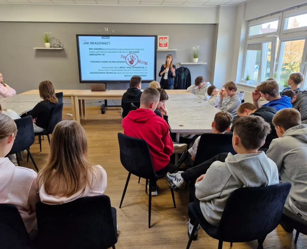 Prawo vs. hejt Szkoła wolna od hejtu. Inicjatywa szerząca świadomość uczniów i uczennic m.in. w zakresie hejtu, form hejtu karalnych przez prawo i odpowiedzialności nieletnich. Pani Mecenas na potrzeby spotkania omówiła także funkcję kuratora nieletniego.